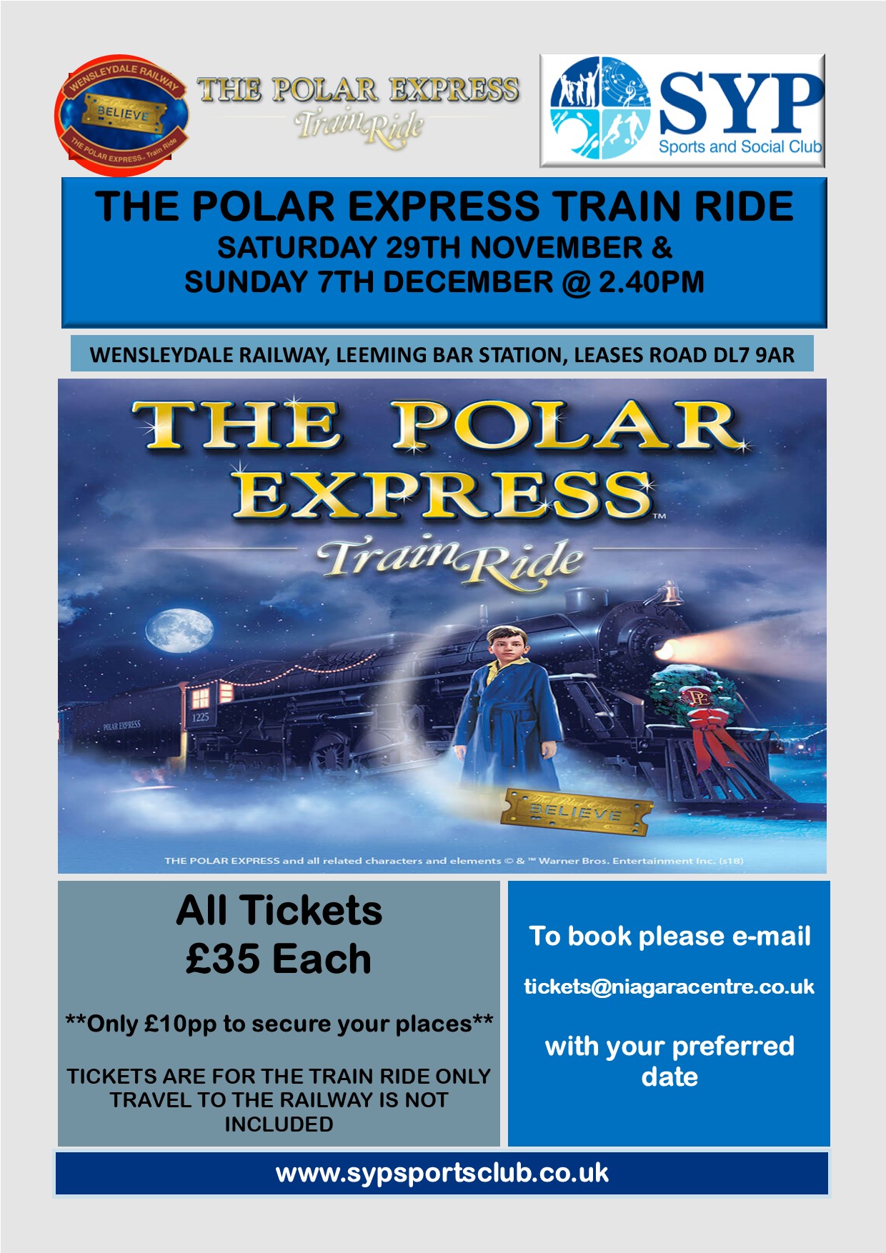 We now have some tickets available for Polar Express on Saturday 29th November at 2:40pm. They are £35 each. We have already done seating arrangements so they must be sold as 2 tickets, 2 tickets and 5 tickets. (we cant put them together or split up the 5). Children under 2 can be added if they sit on your lap (there is an additional charge of £5 if they want a bell).