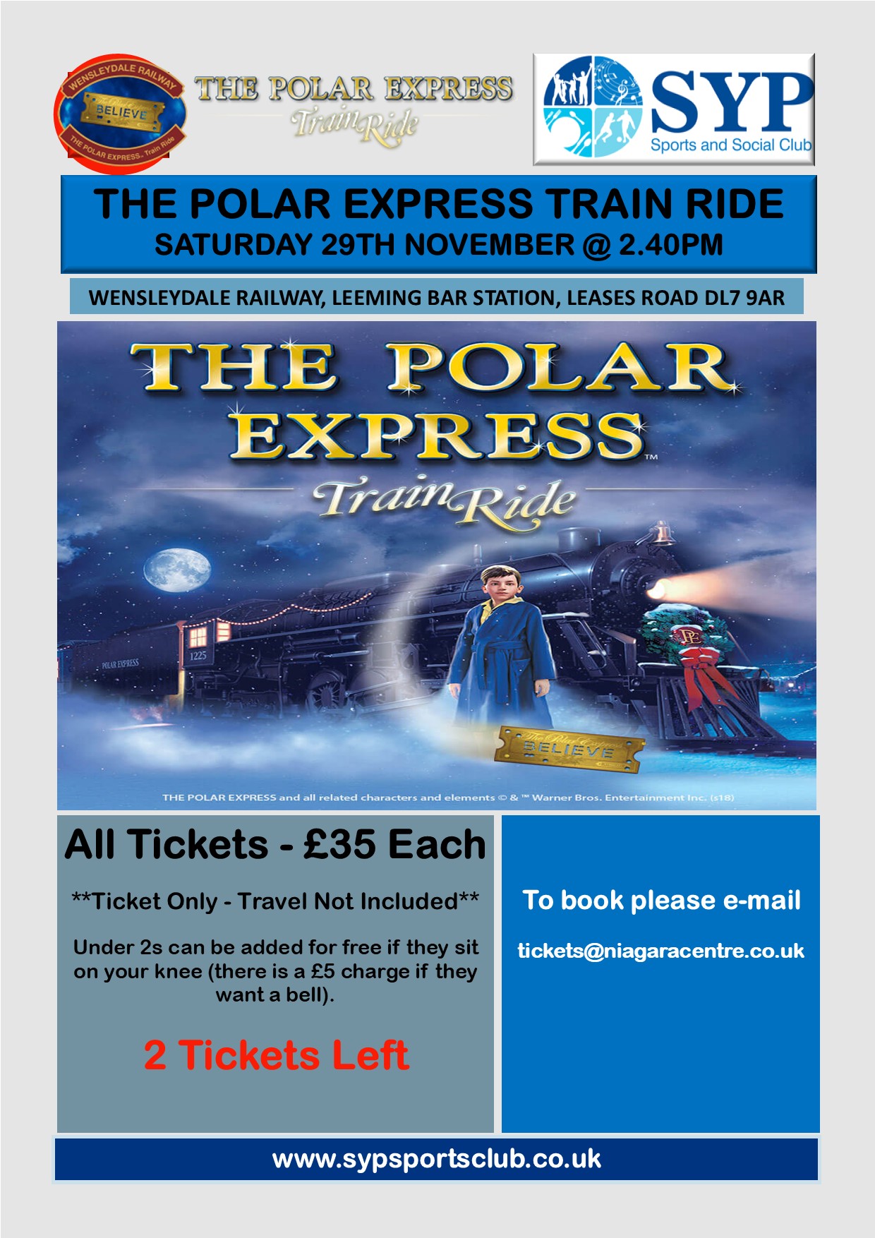 We now have 4 tickets available for Polar Express on Saturday 29th November at 2:40pm. They are £35 each. We have already done seating arrangements so they must be sold as 2 tickets and 2 tickets (the seats are not near each other). Children under 2 can be added if they sit on your lap (there is an additional charge of £5 if they want a bell).